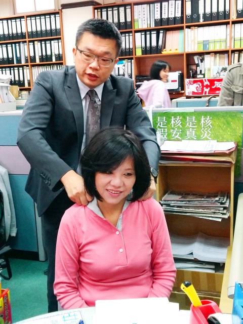 Prior to a DPP press conference late last year, an exhausted DPP Legislator Yeh Yi-jin (葉宜津) told Tsai that she had been suffering from muscle aches for a while, so he gave her a short massage session, which helped her, Tsai said.