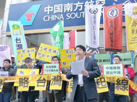 More than 100 demonstrators yesterday sang in unison outside the Taipei office of China Southern Airlines to express their opposition to controversial flight routes proposed by Beijing.