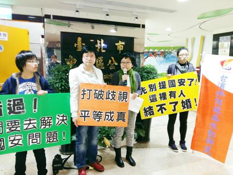 Activists accompanied a lesbian couple who submitted registration forms for this year’s Taipei United Marriage Ceremony.