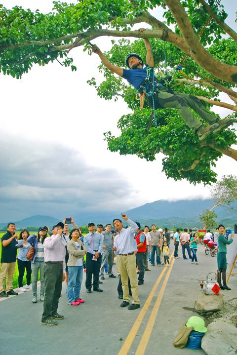 The iconic “Takeshi Kaneshiro tree” — named after Taiwanese-Japanese actor Takeshi Kaneshiro (Jin Cheng-wu, 金城武) and arguably the most famous tree in eastern Taiwan — has made a remarkable recovery at the hands of a Japanese tree doctor after it was uprooted by Typhoon Matmo last year.