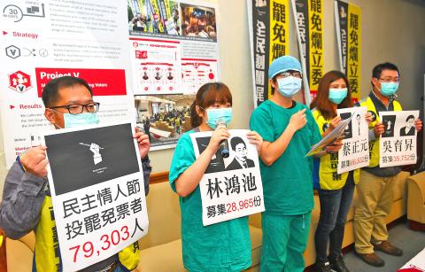 With the help of the V Project online publicity campaign, the organizers recruited 3,000 volunteers to collect 60,000 signatures within eight hours to pass the threshold during the nine-in-one elections on Nov. 29 last year, leading to the nation’s first recall vote since 1994 and generating more than 5,000 news reports, he said.