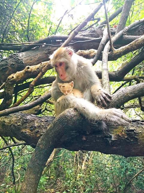 In the clip (https://youtu.be/vrV4gMFu8TM), a monkey dubbed Positi (破四弟) by “father of Formosan macaques” Lin Chin-fu (林金福) — who is known for his years of working to conserve the species — was seen cradling and grooming the kittens.