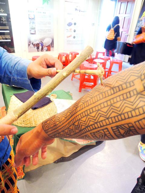 Museum tour guide Chen Wen-shan (陳文山) said that traditionally, all Paiwan tattoos were created with thin needles and ash in a process far more painful than modern tattooing.
