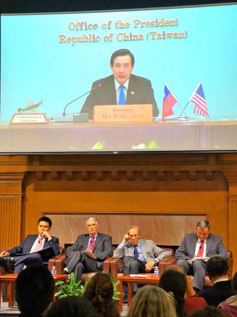 President Ma Ying-jeou (馬英九) recounted his administration’s efforts to promote regional stability as a peacemaker and as a US ally in a video link to a conference with US academics and former US officials organized yesterday by Stanford University’s Center on Democracy, Development and the Rule of Law.