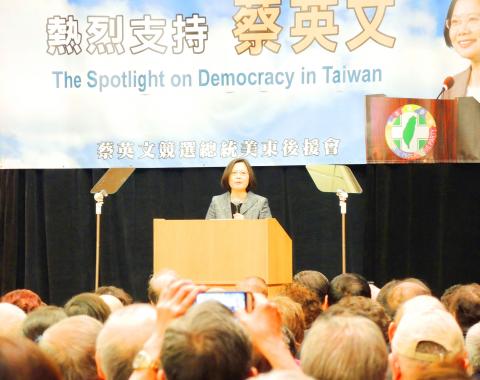 As part of a 12-day tour with visits to six US cities, Democratic Progressive Party (DPP) Chairperson Tsai Ing-wen (蔡英文) addressed nearly 1,000 Taiwanese-Americans and others in New York City on Friday night, who came out to show their support for her and her campaign for next year’s presidential election.