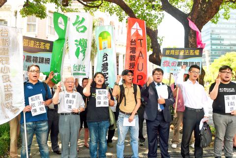 Other petitioners included Northern Taiwan Society chairman Chang Yeh-sen (張葉森), Restoration of Taiwan Social Justice founder Lin Yu-lun (林于倫), Humanist Education Foundation executive director Joanna Feng (馮喬蘭) and Taiwan Association of University Professors chairman Peter Chang (張信堂).