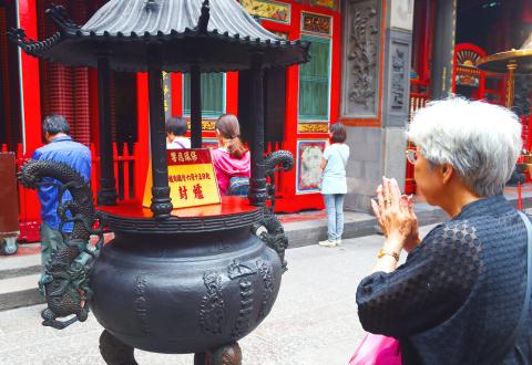 A study by National Taiwan University Hospital last month found that levels of airborne particles measuring 2.5 micrometers or less around the temple were 49 times higher than the city average, and 89 times higher than that around Xingtian Temple (行天宮), another famed city temple that banned incense burning last year.