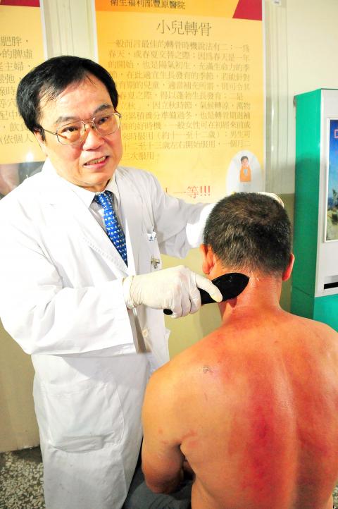 Department of Chinese Medicine director Lin Ching-chung (林慶鐘) said that while gua sha is conducive to easing headaches, sore muscles and heatstroke, it cannot be practiced on injuries or dry skin, or on people with a deficiency of energy.
