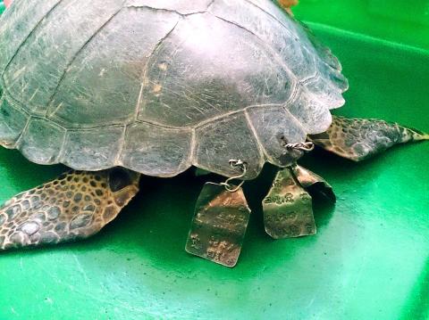 Museum veterinarian Lee Tsung-hsien (李宗賢) said the turtle was in a decrepit state when it was discovered, and its excrement contained scraps of plastic bags and was swarming with parasites.