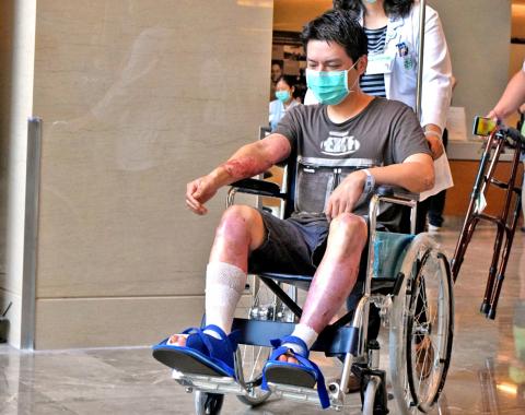 Chen Po-chang (陳柏璋), who suffered burns to 20.8 percent of his body, was wheeled out of the hospital in a wheelchair yesterday afternoon with burns clearly visible on his arms and legs.