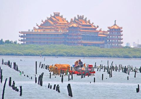 Tourists flock to Changhua County’s Fangyuan Township (芳苑) to see farmers transport oysters from inter-tidal zones to the shore, with the water sometimes reaching up to the buffaloes’ shoulders.