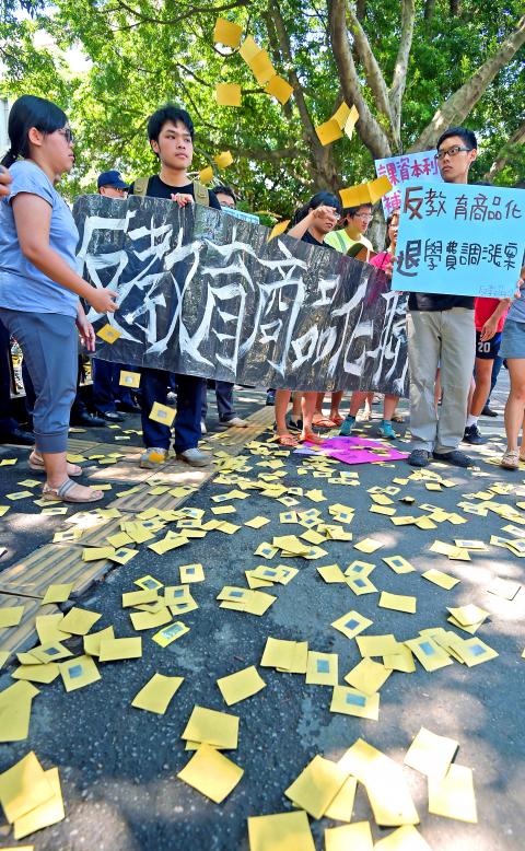 “The Ministry of Education told us that it would conduct a strict review, but there are no indications this promise was adhered to when looking at the results,” protester Lee Su-chun (李蘇峻) said, citing profits of up to NT$250 million (US$7.9 million) earned by many of the universities involved.