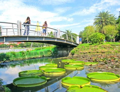 The Kaohsiung Tourism Bureau has planted Victoria water lilies at the southern end of the artificial lake, adjacent to a waterskiing area, bureau Director Hsu Chuan-sheng (許傳盛) said.