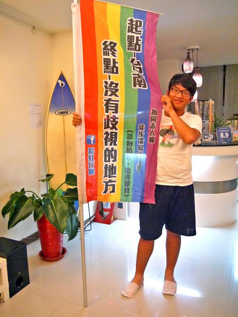 Carrying with him a rainbow colored flag reading: “Starting from Tainan, going to a place with no prejudice,” 17-year-old Chang Tse-yu (張澤瑜) yesterday brandished the poster he had carried with him on a nationwide trip that startat the end of last month, hoping to send a message on Lovers’ Day today wishing happiness to couples as well as to call attention to the issue of tolerance.