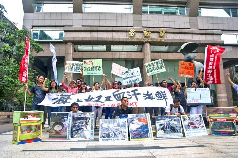 Civil groups and scores of migrant fishermen rallied in front of the Ministry of Labor headquarters in Taipei yesterday, saying their employers have improperly docked money from their salaries and comparing their working conditions to slavery.