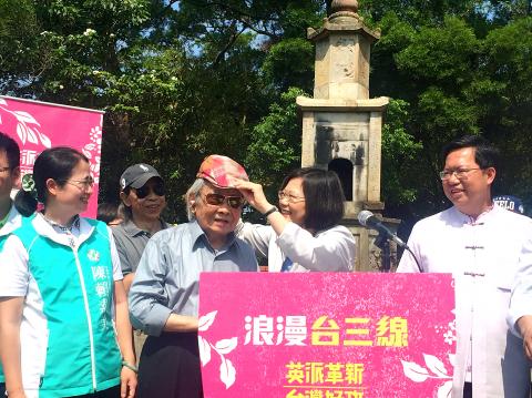 Speaking to local political leaders, supporters and Taiwanese literary writer Chung Chao-cheng (鍾肇政) in front of the Shengjiting (聖蹟亭) — the Pavilion of Sacred Relics — in Taoyuan’s Longtan District (龍潭), Tsai promised to turn the section of the highway that runs through Hakka communities in Taoyuan, Hsinchu County, Miaoli County and Taichung into an important route of development in tourism and agriculture that would lead to local prosperity.