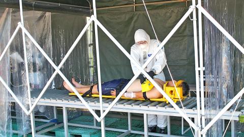 The drill also saw members of Taipower’s repair crew transferred to Taipei Veterans General Hospital to be treated in a quarantine ward for radiation contamination and injuries.