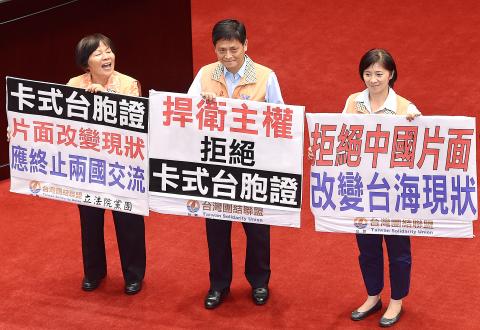 The three TSU lawmakers occupied the podium and held up signs accusing China’s unilateral launch of the new smartcard-like “Taiwan compatriot travel document” (台胞證) as a unilateral change to the “status quo,” saying that cross-strait exchanges should be halted.