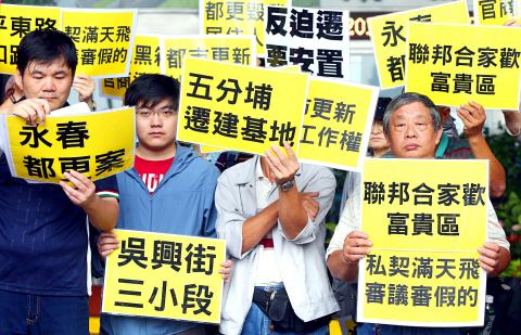 Taipei Urban Regeneration Office division head Chiang Chung-hsin (江中信) declined to comment on whether the city government would punish the firm, saying only that he would pass on the demonstrators’ opinions to an internal review.
