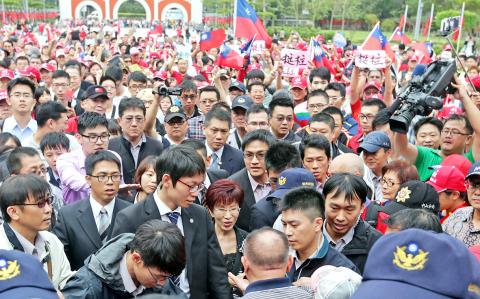 Supporters of Chinese Nationalist Party (KMT) presidential candidate Hung Hsiu-chu (洪秀柱) yesterday gathered outside KMT headquarters in Taipei.