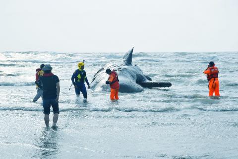 Wang Chien-ping (王建平), director of the Taiwan Cetacean Society and Marine Biology and Cetacean Research Center at National Cheng Kung University, said the whale might have been injured before it became stranded.