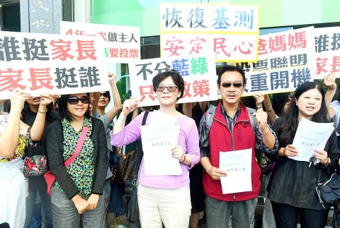 Holding placards reading: “Restore the BCT to make people worry-free” and “Parents support whoever supports parents,” members of the National Parents’ Alliance for 12-year Compulsory Education yesterday rallied outside Tsai’s campaign headquarters in Taipei, saying that if elected, Tsai should restore the BCT, as the current senior high-school entrance programs are too complicated.