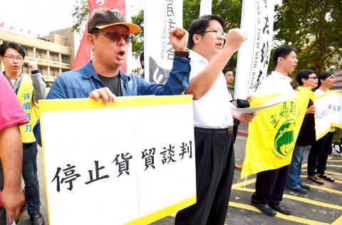 A trade in goods agreement with China would flood the market with cheap Chinese foodstuffs, undermining food safety and harming the agricultural sector, protesters said yesterday during a protest outside the Executive Yuan, calling for negotiations to be halted.