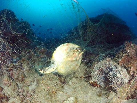 Illegally placed fishing nets and a dead green sea turtle — Chelonia mydas, an endangered species — were earlier this week found in a designated “demonstration area” for ecological protection in Pingtung County’s South Bay (南灣), divers said yesterday.