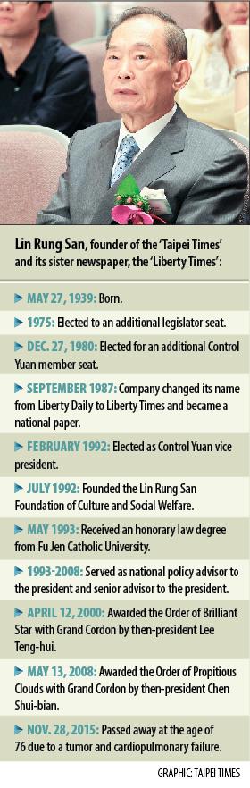 “He views running newspapers as a conscientious enterprise,” journalism professor Cheng Jim-ming (鄭貞銘) said about Rong San Lin (林榮三), founder of the Taipei Times and its sister newspaper, the Chinese-language Liberty Times, in his book titled A Century of Journalists.