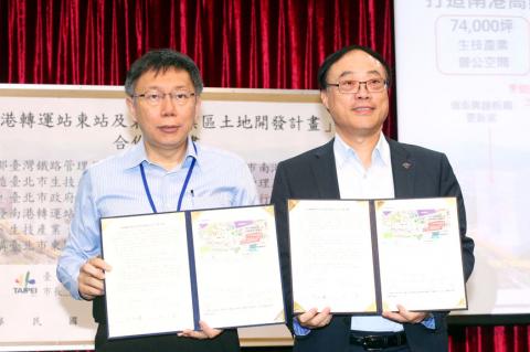 Taipei Mayor Ko Wen-je (柯文哲) yesterday signed a memorandum of understanding (MOU) with Taiwan Railways Administration (TRA) Director-General Chou Yung-hui (周永暉), vowing to transform a 3 hectare commercial district next to the Nangang Station into a transportation hub and a biotech belt connecting clinical research centers in the Nangang District (南港) and production lines in Hsinchu through the High Speed Rail.