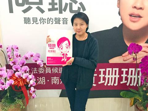 Lee Yan-hsiu (李彥秀), the KMT’s candidate for Taipei’s fourth electoral district, has distributed calendars that could be hung on door knobs to let residents know that she had been in their neighborhood. She has also been handing out traditional promotional items of sanitary tissues and paper towels.