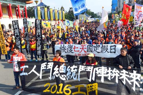 About 2,000 workers and labor rights advocates staged a rally in Taipei yesterday afternoon to urge the three presidential candidates to heed labor rights issues.