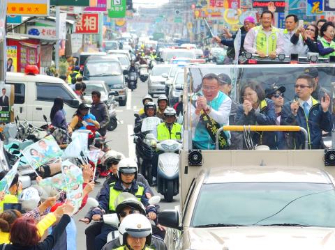 The procession was later greeted by a colder crowd at the embattled Shalu District (沙鹿) in Taichung, where DPP legislative candidate Chen Shih-kai (陳世凱) is pitted against KMT Legislator Yen Kuan-hen (顏寬恆), who is seeking re-election, so the motorcade made a detour to the district to improve Chen’s chance of election en route to Changhau’s Yuanlin Township (員林), where a nighttime rally was held.