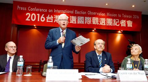The 18 members of the International Election Observation Mission were invited by the Taiwan Nation Alliance and International Committee for a Democratic Taiwan to observe electoral activities from Tuesday until tomorrow, before issuing a report evaluating the electoral process and conduct of political parties using international standards.