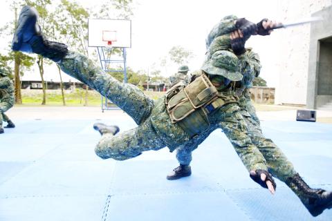 In yesterday’s drills for inspection by Ministry of National Defense (MND) officials, the Army 101st Amphibious Reconnaissance Battalion (ARB 101) “Frogmen” unit strutted their stuff to display their martial arts and other close-combat skills, weapons training, explosives demolition and stealth amphibious landing skills.