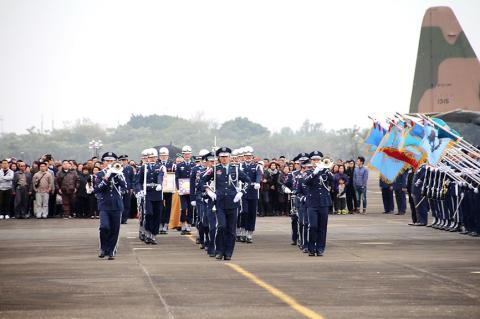 Major Kao Ting-cheng’s (高鼎程) family arrived at the Taiwan Taoyuan International Airport from the US carrying Kao’s ashes, while Air Force Commander General Shen Yi-ming (沈一鳴), members of the air force honor guards and Kao’s classmates received the family at the apron.