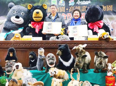 Taipei Mayor Ko Wen-je (柯文哲) and Kaohsiung Mayor Chen Chu (陳菊) yesterday signed a memorandum of understanding (MOU) pledging to collaborative on animal protection efforts between Taipei Zoo and Shoushan Zoo, while Taipei Zoo presented eight endangered animals to its Kaohsiung counterpart.