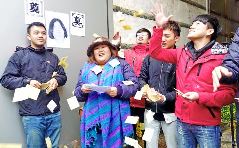 Members of the Indigenous Youth Front held incense sticks while bowing before a picture of film director Chiu Li-kwan (邱?寬) in a mock memorial service, fumbling as they peeled through sheets of joss paper before flinging them in the air.
