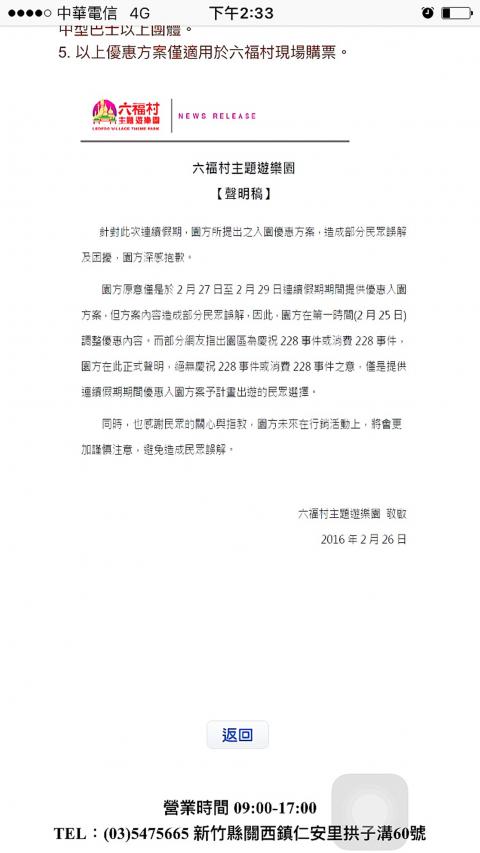 The Leofoo Village Theme Park (六福村主題遊樂園) in Hsinchu County yesterday apologized for any misunderstanding caused by its discount policy for the 228 Memorial Day weekend, following criticism that its commercialization of the event was disrespectful to victims of the tragedy.