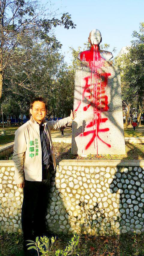 The graffiti on the monument in Nanyuang Park (南苑公園) in the city’s Nantun District (南屯) was discovered by visitors yesterday morning, who reported the incident to Democratic Progressive Party (DPP) City Councilor Chang Yao-chung (張耀中).