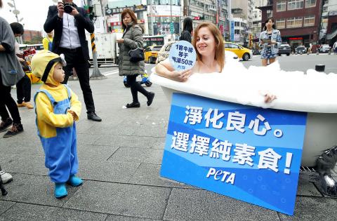 “It takes 11 times more water to produce 1 calorie of animal protein than 1 calorie of plant protein, as a large amount of water is used to grow grain for animal feed, to raise livestock, in cleaning animal waste and in slaughtering,” PETA member Chi Su-ching (戚思晴) said.