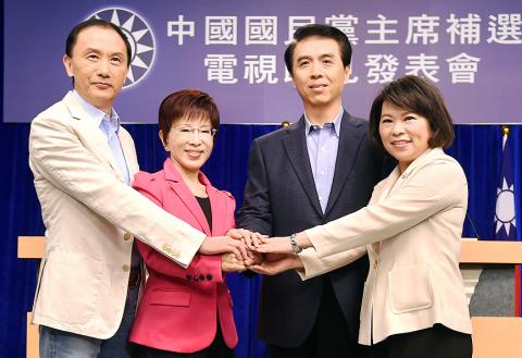 The KMT held the second policy presentation for its four chairperson candidates yesterday.