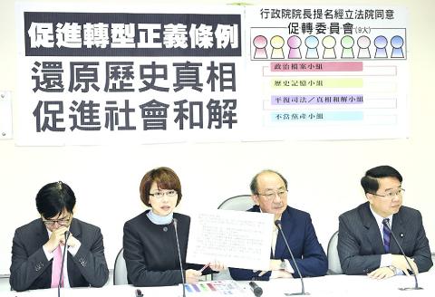 The Democratic Progressive Party (DPP) caucus yesterday announced that it has finalized a draft of the transitional justice promotion act, which includes establishing a transitional justice promotion committee under the Executive Yuan responsible for making political documents available to the public, removing authoritarian symbols, redressing judicial injustice and managing the Chinese Nationalist Party’s (KMT) illegal party assets.