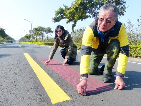 First conceived in Denmark, musical roads aim to keep drivers awake and encourage them to drive under the speed limit, said Liao Yi-chun (廖翊君), a civil engineering student at the university.