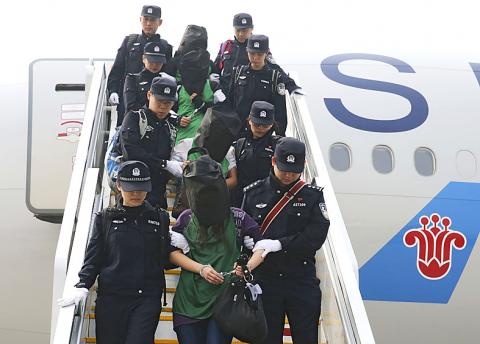 The Taiwanese arrived in Beijing on Wednesday, hooded and handcuffed, after being forced onto a plane by Kenyan police.