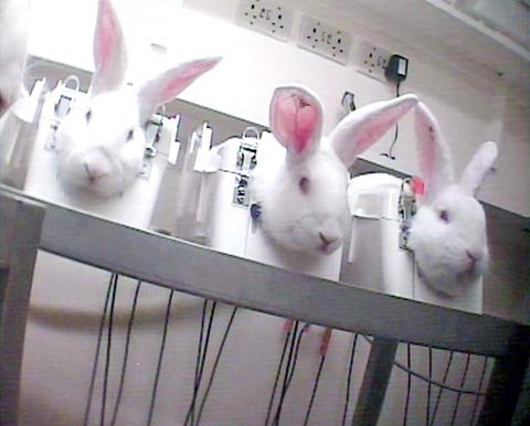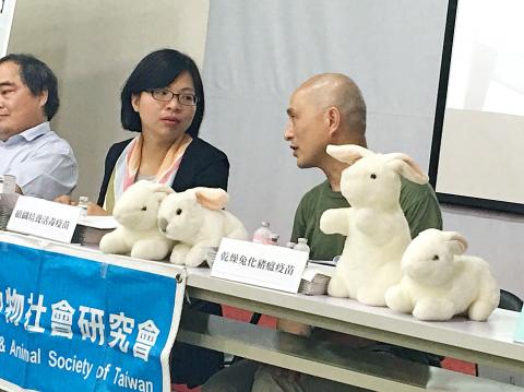 Showing videos and photographs of rabbits locked in tiny boxes and being injected with swine fever virus, the Environment and Animal Society of Taiwan said that the rabbits experience intense pain and are later killed so their organs and tissues can be harvested to make vaccines.