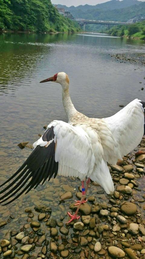 Taiwan Ecological Engineering Development Foundation deputy executive director Chiu Ming-yuan (邱銘源) said the crane was seen with three oriental white storks in New Taipei City’s Jinshan District (金山), where it has made its home.