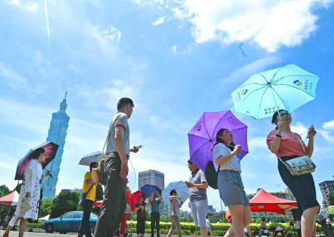 Central Weather Bureau forecaster Chang Hsin-hua (張心華) said the hot weather was mainly caused by a southwest wind, which brings in warmer air, and a low cloud volume.