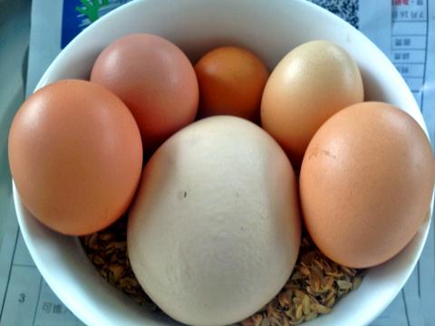 The hen, part of a flock kept by Lin Shih Su-hsia (林施素霞) in her fruit garden in Sigang District (西港), laid the egg on May 20.