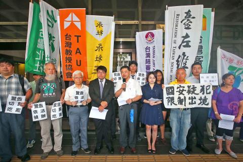 A coalition of groups, including Taiwan Forever Association, Northern Taiwan Society and Taiwan Association of University Professors, held a news conference in front of the Taipei District Prosecutors’ Office building, accusing the agency and the Special Investigation Division (SID) of the Supreme Prosecutors’ Office of ignoring three criminal lawsuits the groups have filed against Ma.